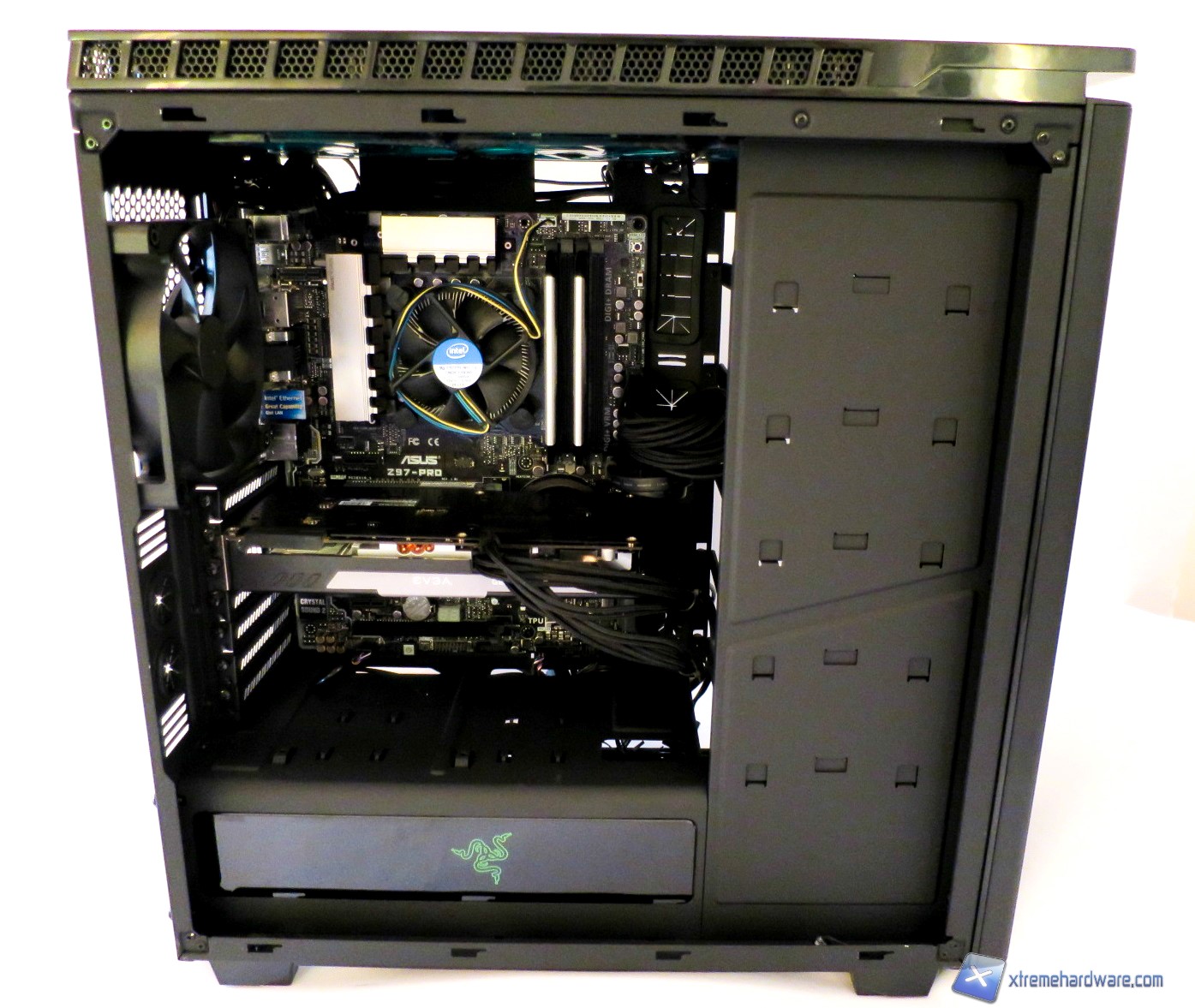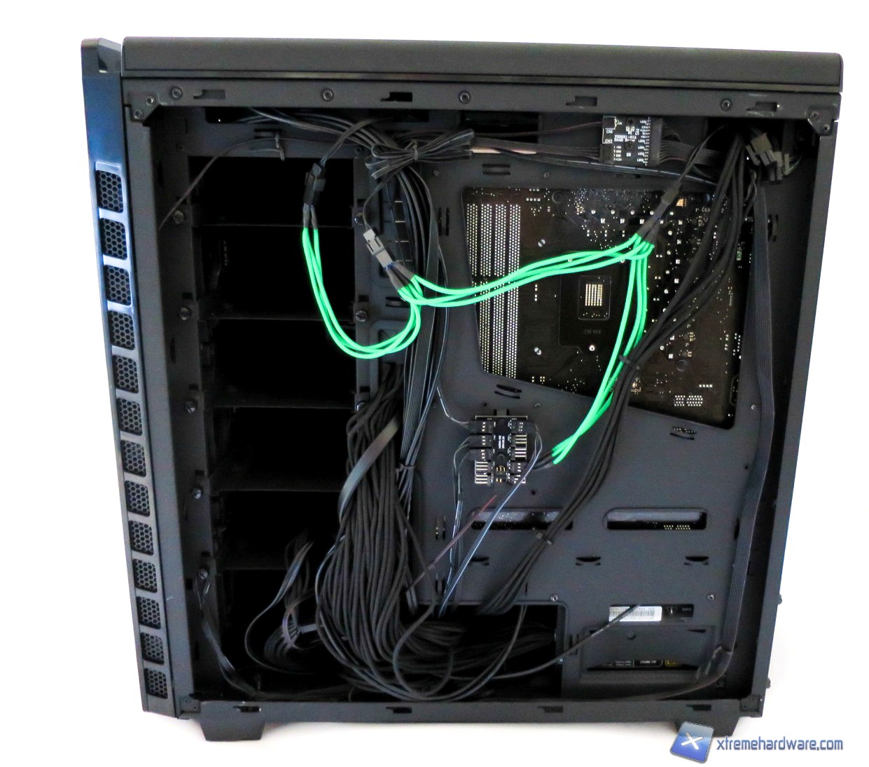 Se si possiede un dissipatore Intel, tramite il solito sistema Push-Pin, sarà possibile installarlo successivamente, altrimenti se avete un dissipatore aftermarket dovrete montarlo prima di installare la scheda madre nel case visto il foro non centrato del piatto della scheda madre. Dopo aver montato il dissipatore sulla scheda madre, sarà necessario montare la scheda video, le RAM ed infine procedere all’assemblaggio dei cavi di connessione del cabinet alla scheda madre. Se avete un alimentatore modulare, consigliamo di collegare tutti i cavi necessari ad esso, prima di inserirlo all’interno del cabinet. A causa del midplate fisso, potrebbe essere piuttosto scomodo aggiungerli in un secondo momento, una volta che l’alimentatore è già installato nel suo alloggiamento.