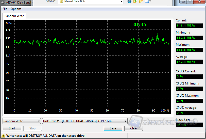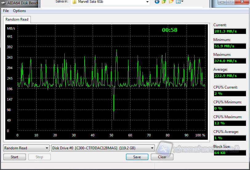 In questo test abbiamo potuto verificare le velocità del drive nella scrittura e lettura casuale (RANDOM) di blocchi di 64KB, con risultati che tendenzialmente ricalcano quanto verificato sino ad ora.